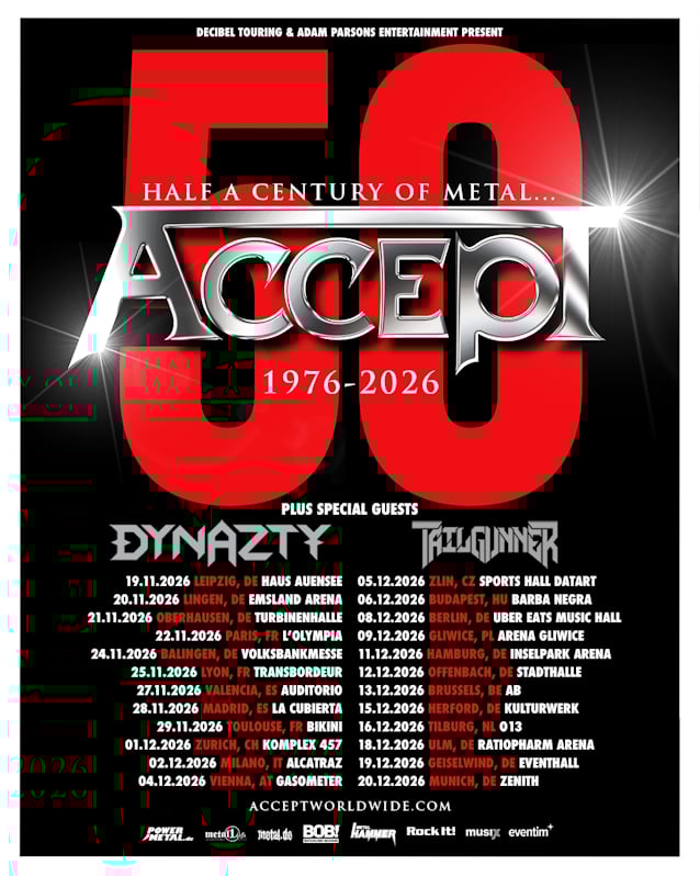 February 19, 2026German/American heavy metal pioneers ACCEPT will celebrate their 50th anniversary with an extensive European tour in late 2026, marking a major milestone in the band's extraordinary five-decade career at the forefront of heavy metal.