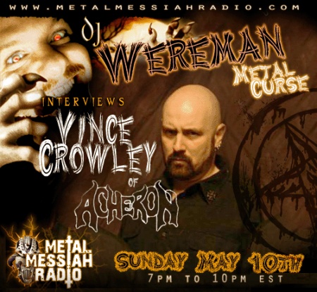 May 9, 2009ACHERON founder Vincent Crowley will guest on "Metal Messiah Radio" this Sunday, May 10 between 7:00 p.m. EST and 10:00 p.m. EST.