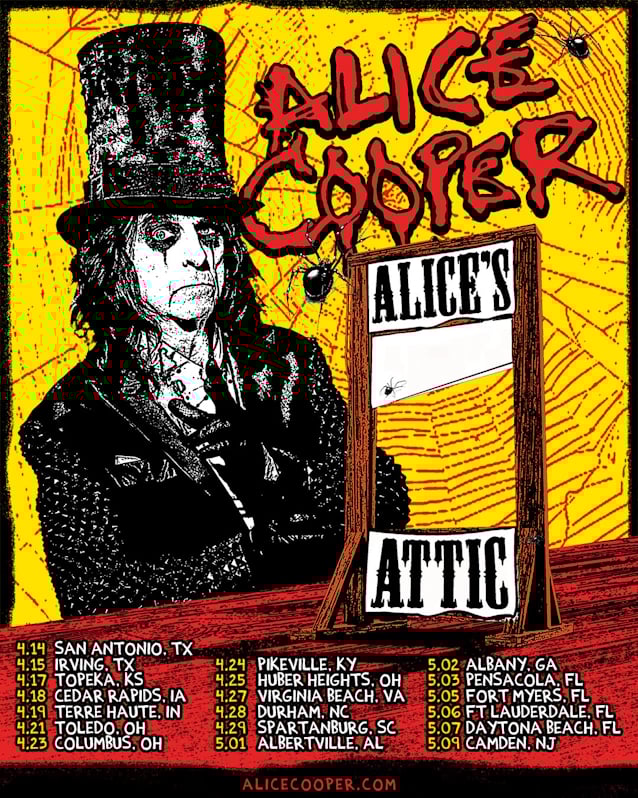 January 26, 2026Rock And Roll Hall Of Famer and music icon Alice Cooper has been bringing his thrilling theatrics to audiences of all ages for decades, drawing equally from horror movies, vaudeville, and garage rock. He will return to stages this spring on his headline "Alice's Attic" tour, which kicks off on April 14 in San Antonio, Texas and runs through May 9 at the Freedom Mortgage Pavilion in Camden, New Jersey. The new production was introduced last fall during Cooper's co-headline trek with JUDAS PRIEST and will now be witnessed by fans in a swath of new cities.