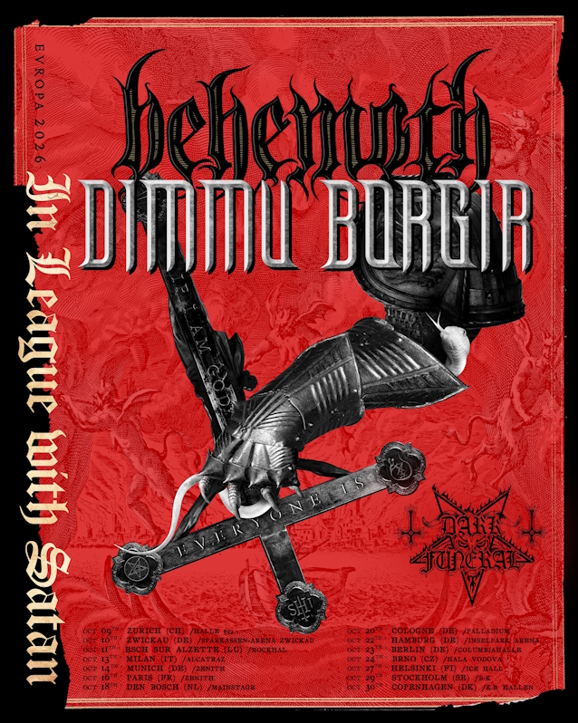 DIMMU BORGIR says: "It's been a few years since we've done a proper European tour, and what a great way to get back out there — teaming up with our brothers in BEHEMOTH for this massive European run. We'll be bringing a brand-new show with us, and we can't wait to share our next chapter with both new and familiar faces."