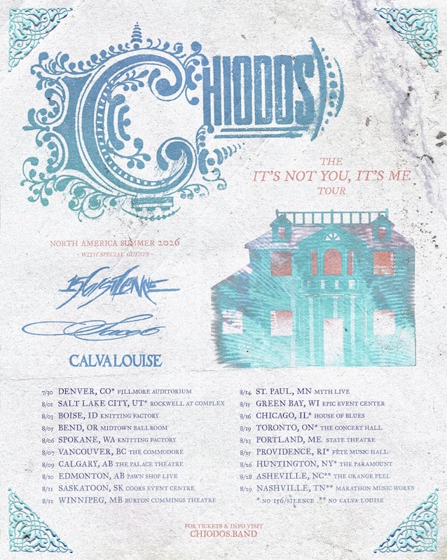 March 18, 2026Post-hardcore favorites CHIODOS have announced a North American tour set for summer 2026, marking the band's next chapter following their long-awaited reunion and a massive year celebrating the legacy of their debut studio album. The run will see the band bring their electrifying live show to cities across the U.S. and Canada with support from 156/SILENCE, SACE6 and CALVA LOUISE. Spotify presale kicks off Wednesday, March 18 at 2 p.m. EST, with general ticket sales opening Friday, March 20 at 10 a.m. local time.