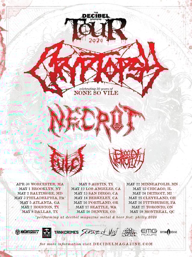"Between the strength of the material on their latest release, 'An Insatiable Violence', and the anniversary celebration of their landmark 'None So Vile', 2026 is clearly the year of peak CRYPTOPSY," Decibel magazine's editor-in-chief Albert Mudrian says. "We couldn't be more honored to bring the band's paramount present and potent past together to headline this year's 'Decibel Magazine Tour'."