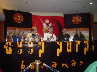 In other news, DEEP PURPLE drummer Ian Paice did a drum clinic (workshop) in Sao Paulo, Brazil (see picture) last Monday (September 8) and the whole band did a press conference in Sao Paulo (see picture) last Wednesday (September 10). Also on Wednesday, DEEP PURPLE recorded three songs and a interview on a Brazilian talk show, called "Programa do Jô" (TV Globo) (see picture),which will be broadcast on September 19. They played "I Got Your Number", "Haunted" and "Smoke On The Water". "Smoke On The Water" will be broadcast another day, probably September 22.