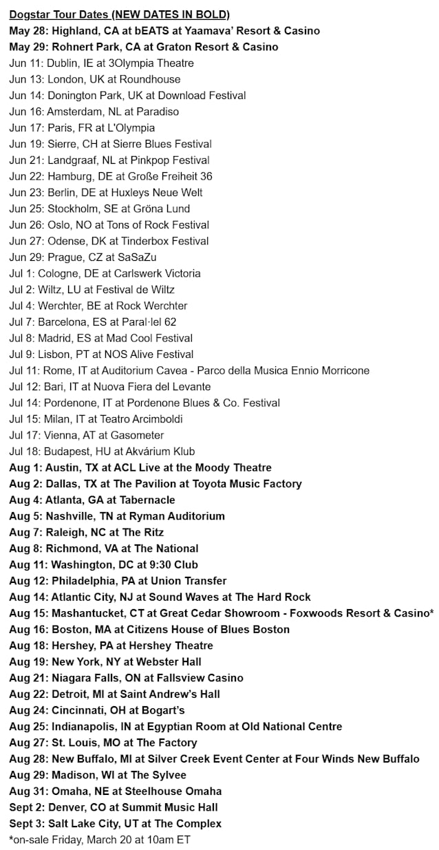 DOGSTAR's 25-date "All In Now" North American tour is set to kick off on May 28 in cities including Austin, Nashville, Washington D.C., Philadelphia, New York City and more. Tickets and VIP for these dates will go on sale Friday, March 13 at 10 a.m. local time (with the exception of the August 15 Mashantucket date which will go on sale Friday, March 20 at 10 a.m. ET). Previously announced European tour and festival dates are on sale now.