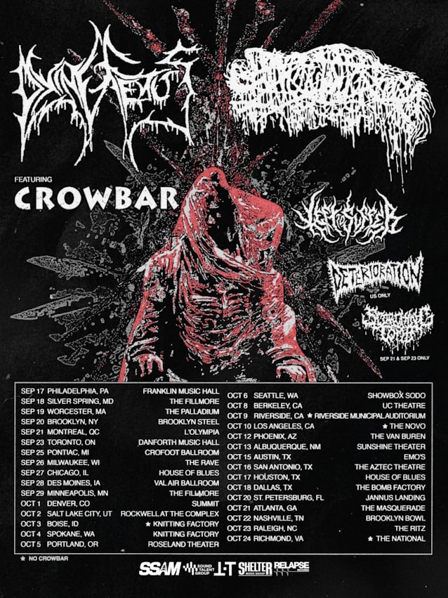 April 28, 2026Death metal titans DYING FETUS are set to decimate stages this fall on a crushing co-headline tour with SANGUISUGABOGG. The trek will kick off on September 17 in Philadelphia at Franklin Music Hall and will run through October 24, wrapping up in Richmond at The National. Support for the tour comes from a stacked lineup including CROWBAR, LEFT TO SUFFER and DETERIORATION, with SCORCHING TOMB appearing on select dates.