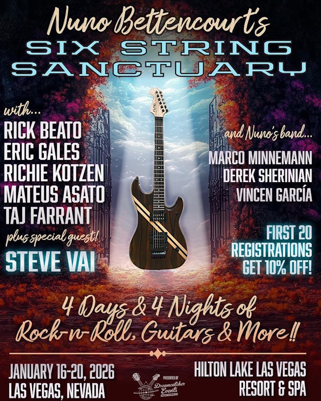 EXTREME guitarist Nuno Bettencourt has announced the first-ever "Nuno Bettencourt's Six String Sanctuary", a four-day celebration for guitarists and music lovers of every age, skill level, and style, set to take place January 16-20, 2026 in Las Vegas, Nevada. Whether you're a seasoned pro, just starting out, or simply a passionate fan, you'll find workshops, performances, and activities designed with you in mind. The vibe is all about community — not competition — so you can fully immerse yourself in the joy of music and the stunning surroundings.