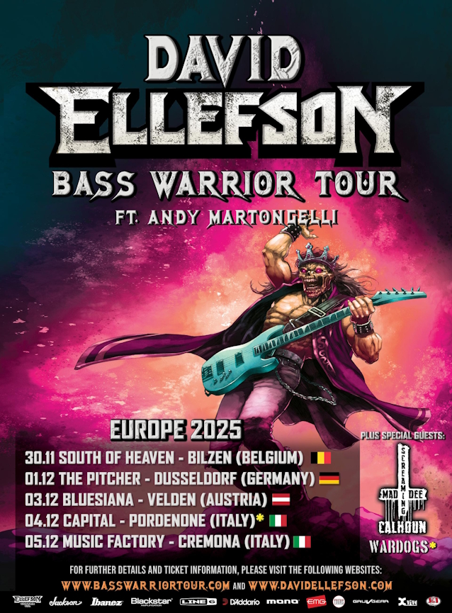 October 28, 2025Former MEGADETH bassist David Ellefson will embark on the fall 2025 European leg of his "Bass Warrior Tour" in late November. The trek will feature Ellefson and his solo band performing select cuts from his well-known catalog of MEGADETH hits, solo material and other hard rock and metal favorites which inspired him during his 40-year music career. Direct support on all dates is Screaming Mad Dee Calhoun. WARDOGS will be joining as additional support on December 4.