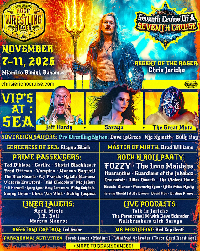 Presided over, as always, by the Regent Of The Rager himself Chris Jericho, the seventh sailing of Chris Jericho's Rock 'N' Wrestling Rager At Sea will once again feature four high-flying days of pro wrestling mayhem, loud music, and immersive adventure on the Caribbean Sea, featuring an all-star assortment of legendary superstars of the squared circle, including Jeff Hardy, Saraya, The Great Muta, Dave LaGreca, Nic Nemeth, Bully Ray, Elayna Black, Ted DiBiase, Carlito, Shotzi Blackheart, The Shockmaster, Vampiro, The Blue Meanie, A.J. Francis, Natalia Markova, Victoria Crawford, "Kid Chocolate" Mo Jabari, Indi Hartwell, Lacey Lane, Kacy Catanzaro, Ricky Knight Jr., Sonny Onoo, Chris Van Vliet, Gabby LaSpisa, and more to be announced. The incredibly stacked card will also boast electrifying musical performances by FOZZY, THE IRON MAIDENS, KUARANTINE, GUARDIANS OF THE JUKEBOX, DOWNSTAIT, KILLER DWARFS, THE VIOLENT HOUR, BEASTO BLANCO, PEROXWHY?GEN, LITTLE MISS NASTY, JEREMY WOULD LET ME DROWN, DAVID ROY and DUELING PIANOS; the comedy stylings of Brad Williams, April Macie, J.B. Ball and Marcus Monroe; live podcast recordings (including "Talk Is Jericho", "The Paranormal 60 With Dave Schrader" and "Rulebreakers With Saraya"),and an extensive selection of talent-hosted experiences, autograph and photo sessions, paranormal activities, and more.