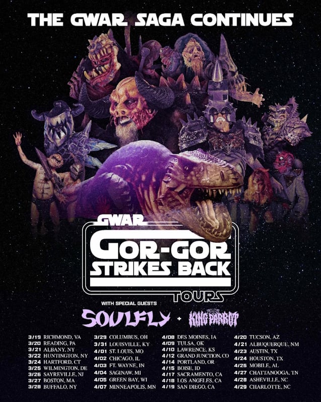 December 15, 2025Intergalactic shock rock legends GWAR are returning to destroy stages across the United States with the announcement of the "Gor Gor Strikes Back" tour, a massive spring 2026 run featuring SOULFLY as direct support and KING PARROT opening every night. The carnage kicks off March 19 in GWAR's adopted hometown of Richmond, Virginia, and rampages through April 29, ending in Charlotte, North Carolina. A complete list of dates is below. Armed with fresh atrocities, new victims, and the unstoppable might of Gor Gor himself, GWAR are promising their most crushing live spectacle yet.
