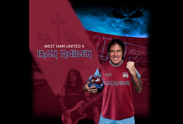 The new shirt, which is available to purchase now, is the latest product within the "Die With Your Boots On" football clothing range. The claret and blue shirt is the next milestone in the 50th-anniversary celebrations, which earlier this year saw IRON MAIDEN play an incredible sold-out concert at the Hammers' home, London Stadium.