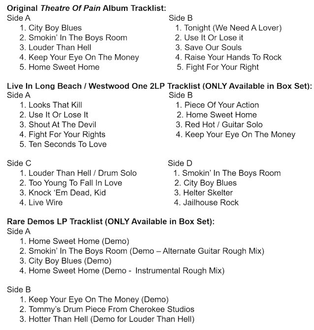 The 40th-anniversary deluxe box set for "Theatre Of Pain" is a must-have for fans and collectors, featuring reimagined artwork, the newly remastered album on color vinyl, a never-before-released 1985 Long Beach live concert (2LP),rare demo recordings (1LP),and a 76-page hardcover book packed with never-before-seen photos and memories from the "Theatre Of Pain" era. This definitive set captures the raw energy and spirit of a band at their peak — and is available only for a limited time.