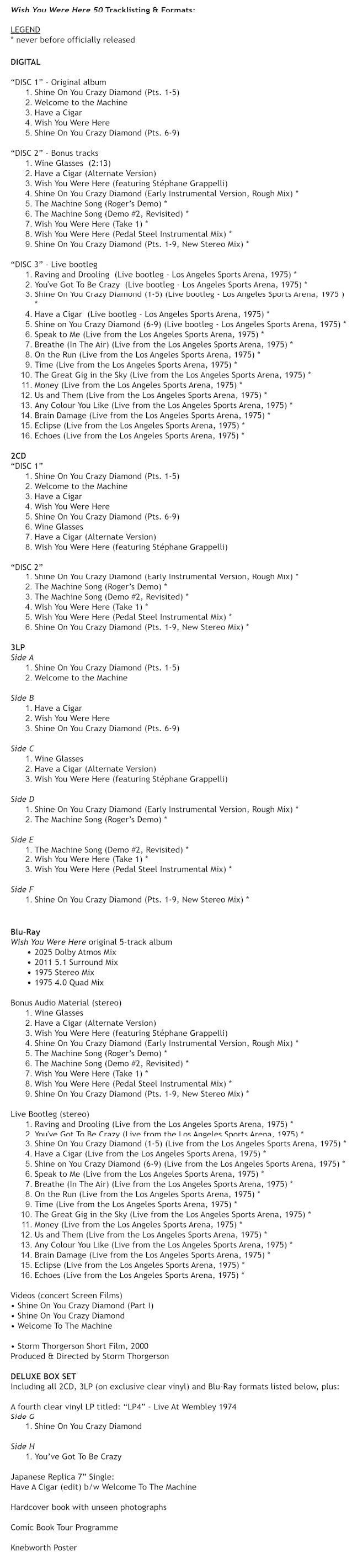 "Wish You Were Here 50" will be released in multiple formats, including 3LP, 2CD, Blu-ray, digital and a Deluxe Box Set. The digital release includes the original 1975 album, featuring a new Dolby Atmos mix by James Guthrie, whose work with PINK FLOYD dates back to 1979's "The Wall". It also includes 25 bonus tracks made up of nine studio rarities, and 16 live recordings captured by the renowned bootlegger Mike Millard at PINK FLOYD's Los Angeles Sports Arena concert on April 26th 1975, now receiving its first official release. The live audio has been meticulously restored and remastered by Steven Wilson. The Blu-ray edition also gives fans the chance to see three concert screen films from the band's 1975 tour, plus a Storm Thorgerson short film. The 3LP and 2CD formats include the original album and the nine studio bonus tracks. The Deluxe Box Set includes all 2CD, 3LP (on exclusive clear vinyl) and Blu-ray material, plus a fourth clear vinyl LP, "Live At Wembley 1974", a replica Japanese 7" single of "Have A Cigar" b/w "Welcome To The Machine", a hardcover book including unseen photographs, a comic book tour program and Knebworth concert poster. Exclusive 50th-anniversary Merchandise along with limited-edition product releases will also be available at PinkFloyd.com.
