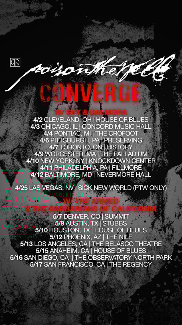 January 20, 2026POISON THE WELL has announced a spring 2026 headline tour. CONVERGE will support, with BALMORA, SPY, THE ARMED and THE BARBARIANS OF CALIFORNIA appearing on different segments. Artist pre-sale tickets go live Wednesday, January 21 at 10 a.m. local time. General on-sale begins Friday, January 23 at 10 a.m. local time.