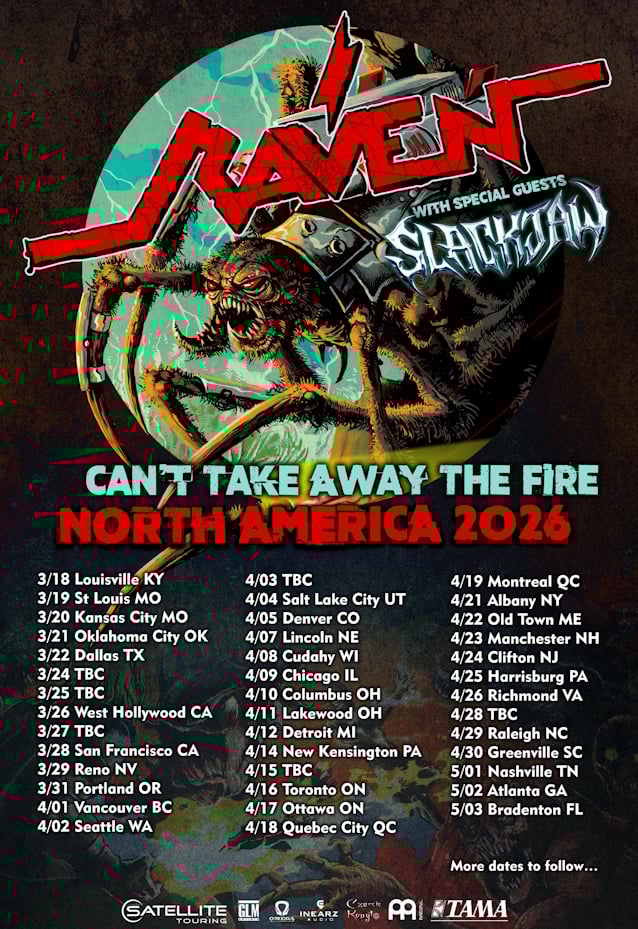 RAVEN vocalist/bassist John Gallagher states: "After our 'medical gap year' of 2025, we are hungry and itching to get back to doing what we do best — cranking out the megawatts and putting on a RAVEN metal show for the lunatics out there. We have a killer band SLACKJAW out with us as special guests on these shows and it's gonna be a take-no-prisoners full-out affair!"