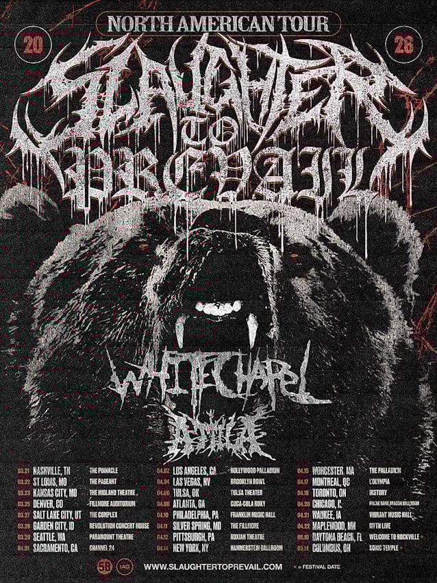 December 9, 2025Russian metal powerhouse SLAUGHTER TO PREVAIL has announced a spring 2026 North American headlining tour. Featuring special guests WHITECHAPEL and ATTILA, the month-long run kicks off on March 21 in Nashville, with stops to follow in Denver, Seattle, Los Angeles, New York, Toronto, Chicago, and more. Tickets, including VIP packages, will be available Friday, December 12 at 10 a.m. local time.