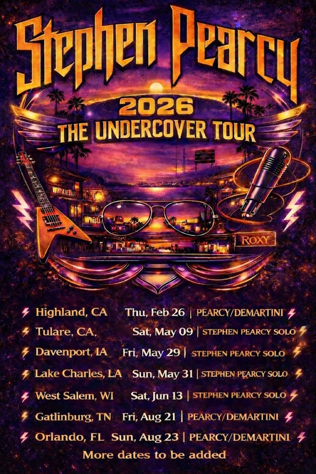 February 4, 2026As he continues to lay down tracks for his upcoming sixth solo album, Stephen Pearcy — the voice of RATT — has announced his initial tour dates for 2026. Billed as "The Undercover Tour", the itinerary will be highlighted by performances with guitarist extraordinaire Warren DeMartini — his longtime bandmate in RATT and current touring partner — under the PEARCY/DEMARTINI moniker. The first date of 2026 is a PEARCY/DEMARTINI show on February 26 at the Yaamava' Theater in Highland, California.