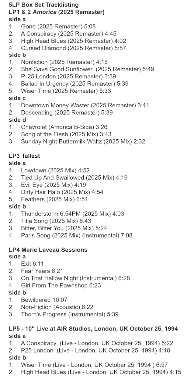 The deluxe box set features "Tallest", a studio album of nine newly mixed songs from the "Tall" sessions. "Tall", the legendary unreleased album recorded before "Amorica", was initially scrapped by Chris and Rich to bring a new creative energy to the recording of "Amorica". George Drakoulias and Martin Pradler have done new mixes from the original multitrack recordings. The set includes three unreleased recordings: "Bitter, Bitter You", "Title Song" and "Paris Song", an instrumental that evolves into the "Amorica" track "Cursed Diamond".