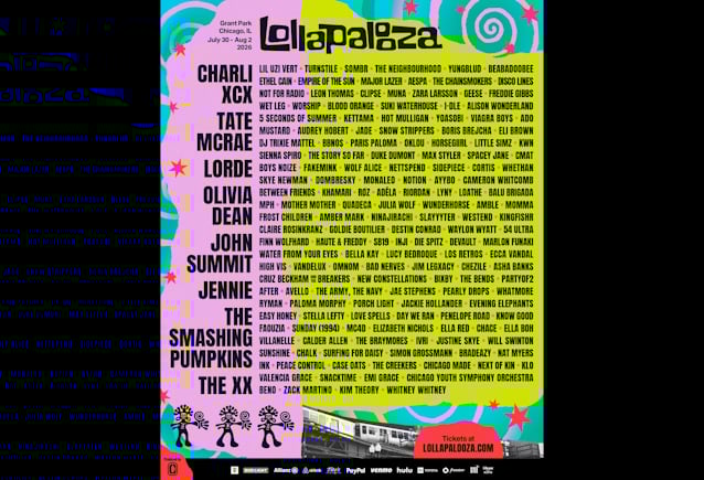 March 17, 2026THE SMASHING PUMPKINS, CHARLI XCX, TATE MCRAE, LORDE, OLIVIA DEAN, JOHN SUMMIT, JENNIE and THE XX are set to headline Lollapalooza 2026, which will also feature performances by LIL UZI VERT, TURNSTILE, SOMBR, THE NEIGHBOURHOOD, YUNGBLUD, BEABADOOBEE, ETHEL CAIN, EMPIRE OF THE SUN, MAJOR LAZER, ZARA LARSSON and much, much more. The legendary annual celebration of music takes place July 30-August 2, with more than 100 artists on eight stages, delivering four full days of music and interactive programming in Chicago's crown jewel, Grant Park.
