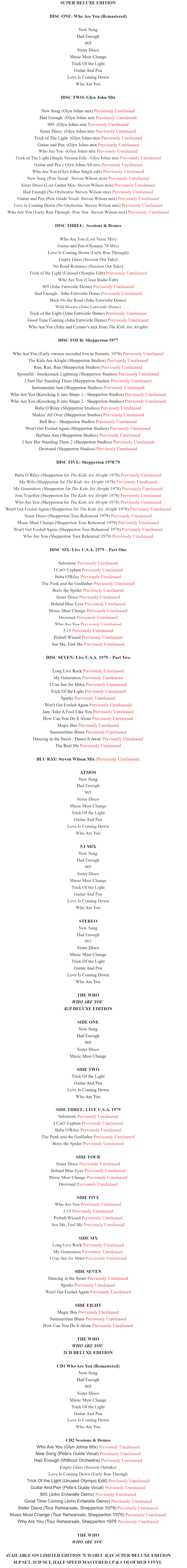 CDs 6 & 7: Live recordings from the 1979 U.S. tour, including tracks recorded at the Pontiac Silverdome, the Spectrum in Philadelphia and the Masonic Temple, Detroit, including a rare live version of John Entwistle's "Trick Of The Light"