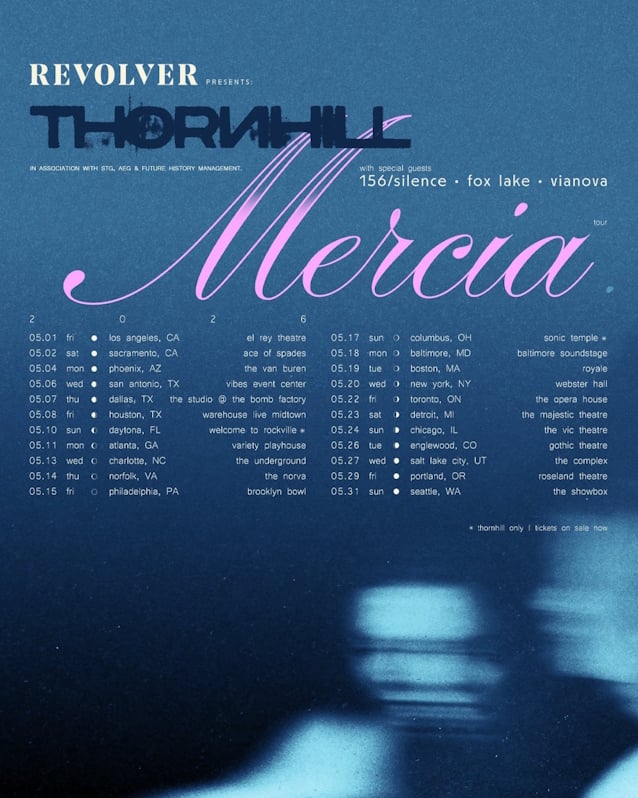December 16, 2025Australian alternative metal band THORNHILL will embark on a North American tour in May 2026. Support on the trek will come from 156/SILENCE, FOX LAKE and VIANOVA. The tour will kick off on May 1 at the El Rey Theatre in Los Angeles, California and will wrap up on May 31 at The Showbox in Seattle, Washington.