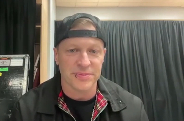 Asked by MikeZ if THREE DAYS GRACE ever got a chance to share the stage with METALLICA at various festivals over the years, Brad said: "On a few, yeah. And we are on the same management [Q Prime], so we're always kind of nudging management, 'Okay, when's our turn [to tour with METALLICA]? Let's go.' Which would be amazing. But they're great guys. And I think for us to see a band like that still going after so long, it's something to look up to and it's pretty awesome."
