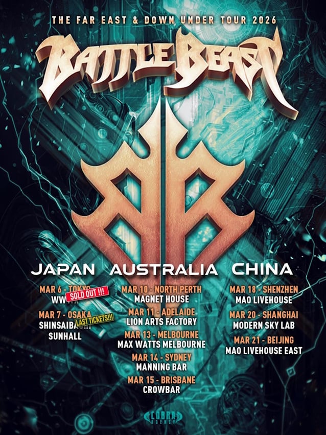 BATTLE BEAST's most European tour started with a bang on October 17, 2025 with the band's biggest German headline show to date at Hamburg's Inselpark Arena. The trek, with DOMINUM as the special guest and Sweden's rising power metal force MAJESTICA as the opening act, kept BATTLE BEAST on the road until mid-December 2025.