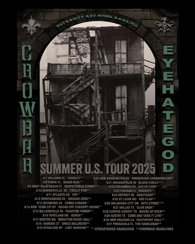 August 8, 2025CROWBAR kicked off its U.S. co-headlining tour with EYEHATEGOD last night (Thursday, August 7) at Conduit in Orlando, Florida. Fan-filmed video of the show can be seen in the YouTube playlist below, courtesy of IFM RAW. (Note: After each song, the YouTube player automatically jumps to the next song in the playlist.)