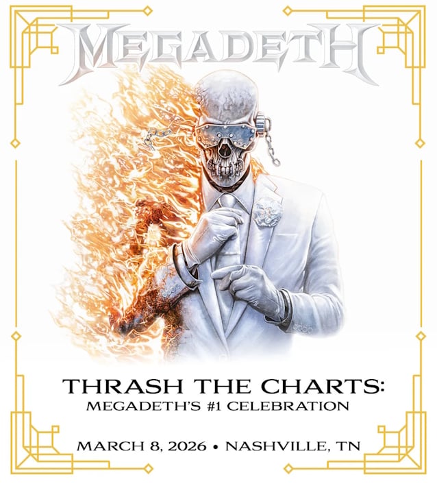 March 9, 2026On Sunday, March 8, MEGADETH held an exclusive celebration party honoring the band's Billboard Top 200 No. 1 debut (first-ever No. 1 Top 200 in MEGADETH's career),as well as seven other No. 1 Billboard chart debuts in the U.S. and an array of No. 1s globally. This once-in-a-lifetime event, dubbed "Thrash The Charts", in La Vergne, Tennessee brought fans inside the victory lap with an intimate, high-energy evening celebrating MEGADETH's chart-topping moment.